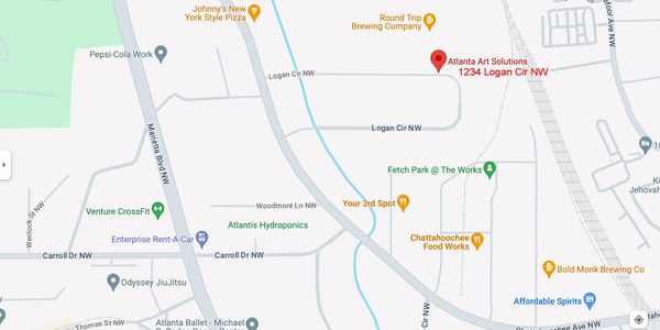 Atlanta Art Solutions is located at 1234 Logan Cir NW, Atlanta, GA 30318. We are Just Around the corner from The Chattahoochee Food Works and Top Golf.We are located on Logan Circle close to many other design and home furnishing businesses. Come in and see what we can do! We are open 10-6 Monday thru Friday with plenty of parking in front our building.